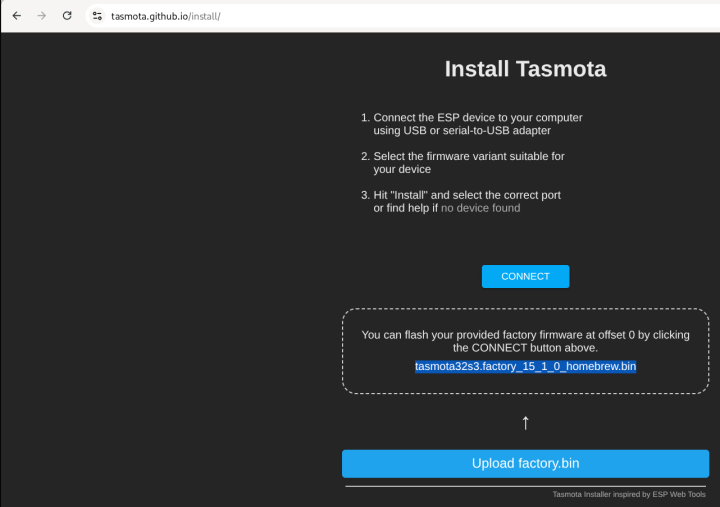 Das fertige Firmware Image tasmota32s3.factory_15_1_0_homebrew.bin kann auf den ESP32 z.B. via Tasmota Web Installer programmiert werden.